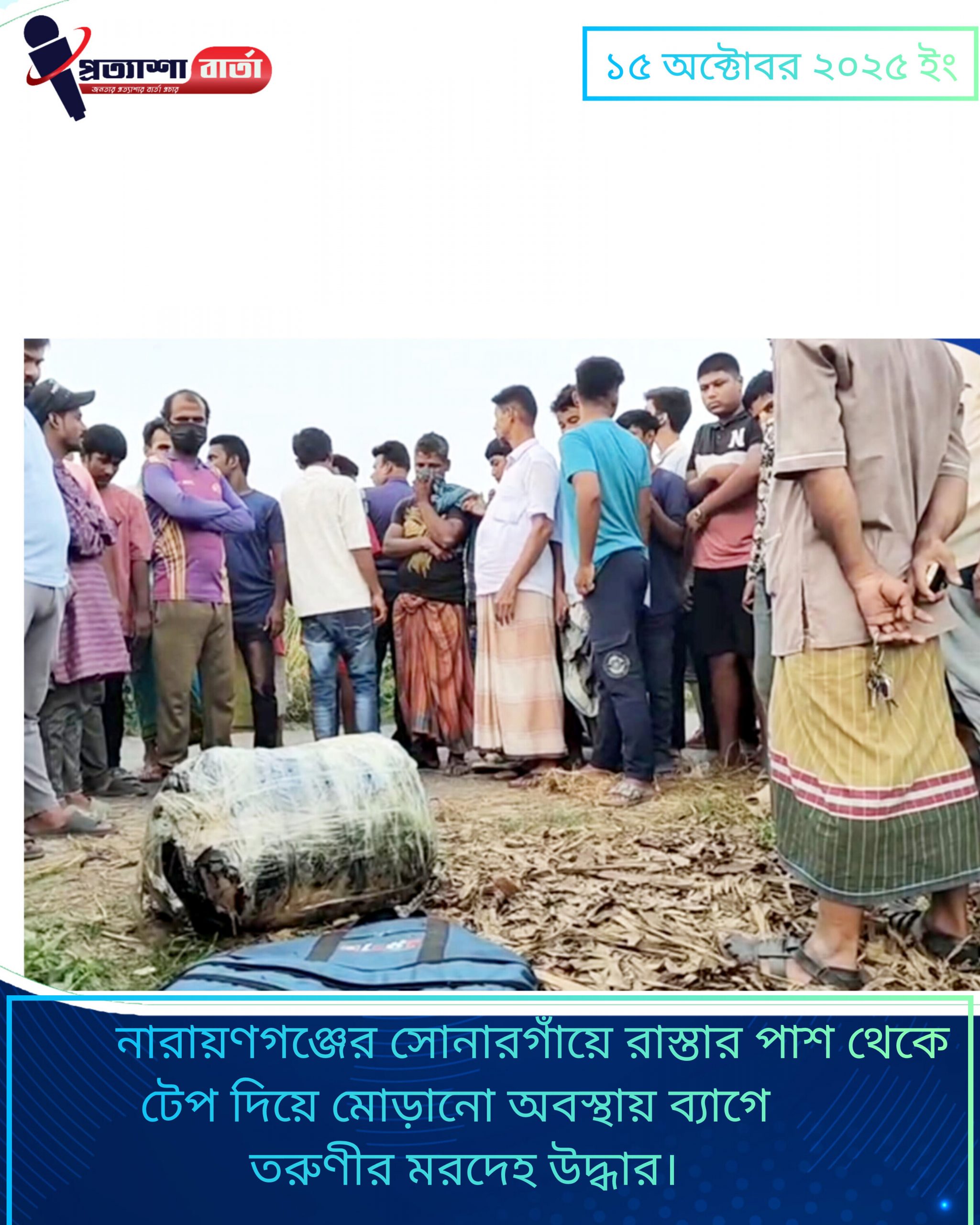 নারায়ণগঞ্জের সোনারগাঁয়ে রাস্তার পাশ থেকে টেপ দিয়ে মোড়ানো অবস্থায় ব্যাগে এক তরুণীর মরদেহ করেছে পুলিশ।